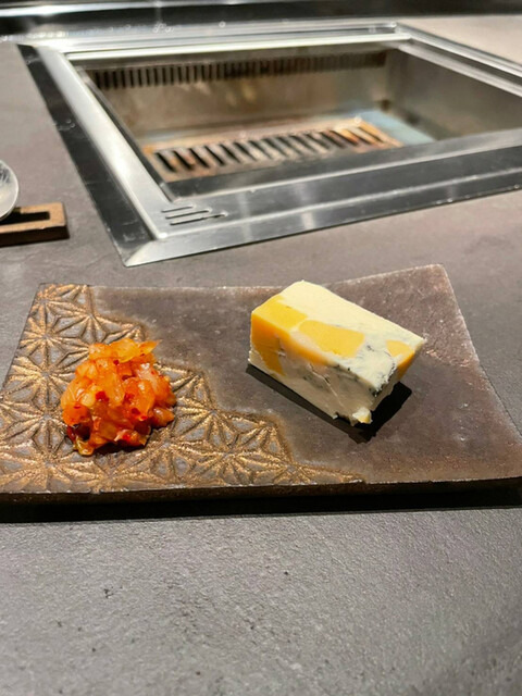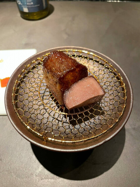 今回は目の前でシェフがすべてをガイドしてくれるカウンター席にてシェフズコースを堪能した。最初にお肉を見せて頂きました。知床和牛ヒレ肉を中心としたブロック肉が山盛り。高まる期待。網がのる取り皿は余分な脂が落ちる仕様だが、とっても仰々しくて貴賓ある。