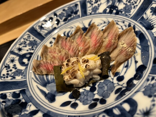 続いて登場したのは、マルカワのたたき。白ポン酢の程よい酸味が素材を引き立て、“雪”を思わせる盛りつけと相まって、視覚・味覚ともに洗練された印象を受けました。