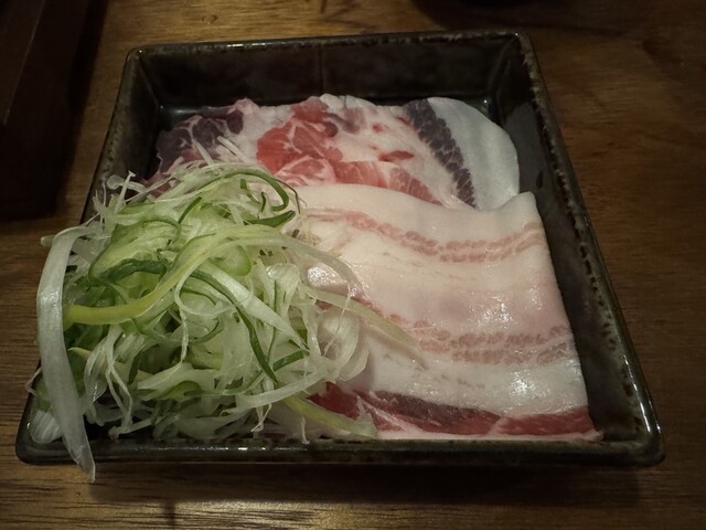 お肉とネギのセット。 アグー豚のバラ、ロースなど、ネギに巻いて食べる