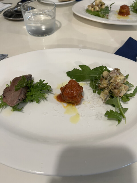 前菜(ローストポークとインゲンのサラダ、イタリアミートボール、豚タンのコンフィ)、ピザ(マルゲリータ、サルシッチャと黒キャベツ、ビスマルク)、パスタ(燻製モツァレラとじゃがいも)、デザート(アラゴスタ、ティラミス、アップルパイ、アイスを誕生日プレートをお願いして(要予約))を頂きました。