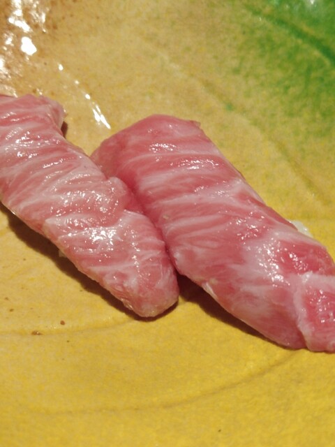 桜の花びらと葉を添えた大トロがニ貫。見えないけど一貫は葉にくるまってました(笑)うまい。。旨すぎる。千万石饅頭!って感じwwwლ(´ڡ`ლ)