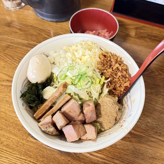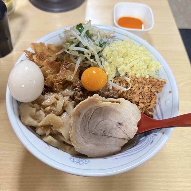 夜の話人気メニュー。極太縮れ麺をジャンクなまぜそばで食べられます。