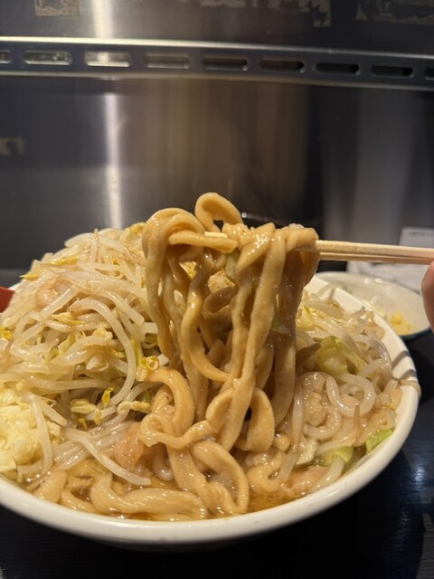 ヤサイはシャキ感を残した絶妙な茹で加減で、アブラと一緒に頬張るのが至福。麺はワシワシとした食感の極太麺で、濃厚な味噌スープに全く負けない存在感があります。