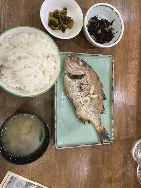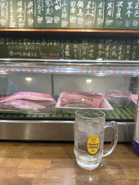 前にお昼に来たけれどランチ営業は不定期だったので開いてなかったお店がランチやってたのでとても嬉しい気持ちでお店に入りました。 ランチは現金のみ。夜はクレジットも。焼き物はお時間かかるみたいだけど、それ以外は早くでるらしい。 焼き物のお魚はほうぼうとかみだいとか、あんまり馴染みがない名前だけど、カウンターに並んでる魚の切り身がとても美味しそう。 お冷のジョッキが水なんだけどお昼からなんだか背徳感のあるやつで嬉しい。お魚とっても美味しいかったです。