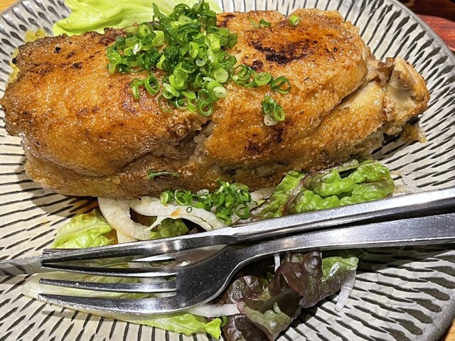 豚足カリカリ焼き ホントに逸品です。こんなの初めて食べました。注文してからフライパンでお姉さんが焼きます。途中お酒注いだり色々しながら焼きます。こっちが美味しく飲んで間もずっと焼いてます。途中途中ちゃんと動かし、時々真温測ります。鉄串刺して唇に当てるよくテレビとかで見るやつです。ずっと焼いてます。暫くすると炭の上に!一気にフィニッシュ。お待たせしました〜と丸ごと出て来ました。自分で切るタイプなんだ‥と押さえ用にフォークを刺す‥?ナイフで切るとパリパリの皮が切れて中はトロトロです。カリカリの皮を切る為のナイフで後はフォークで十分なほどの柔らかさバラけた身と皮を食べて骨をしゃぶる位。味も最高です。独特の臭みや半端な脂の塊はありません。これを食べると豚足好きになるなぁって思います。