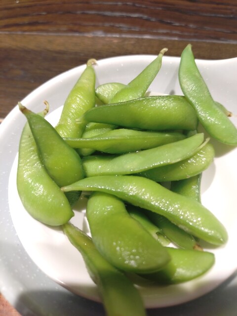 お通しのワサビ味の枝豆に、肉厚な鶏軟骨、そしてタコキムチでチビチビ飲む。