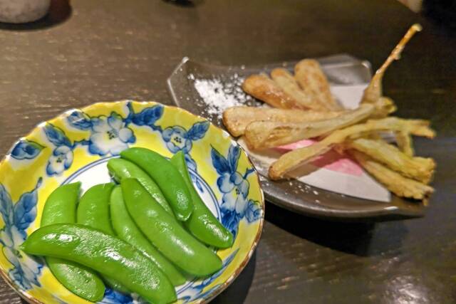 スナップエンドウが美味しすぎたので塩ゆでを単品で頼んでしまいました✨このタイミングで 島らっきょの天麩羅 も追加!めちゃ美味しかったです(^^