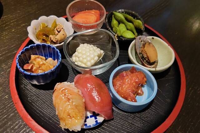 小鉢盛り(ホワイトコーン、たこの梅和え、イカと甘長唐辛子のきんぴら、泉州フルーツトマト、京都の枝豆、とこぶし、ネギトロ 寿司(まぐろ)、寿司(あなご))