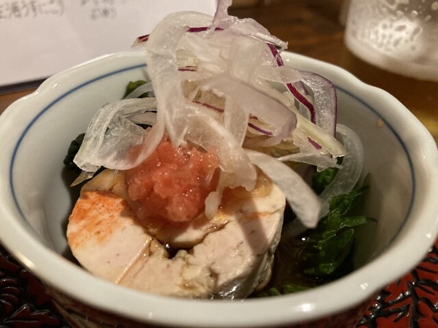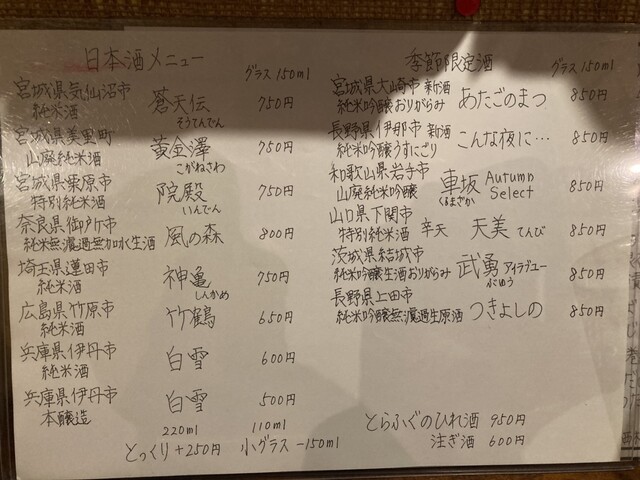 まずは生ビール。丁寧に注がれていて旨い。すぐにあん肝ポン酢。ビールが無くなった頃に刺身盛り合わせ。つぶ貝がコリコリで旨い。たまらず日本酒へ。