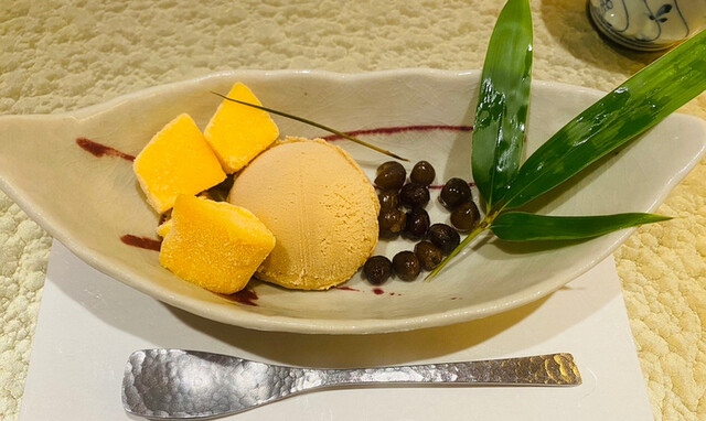塩えんどう豆が添えられたキャラメルアイスのデザートで締めくくり。