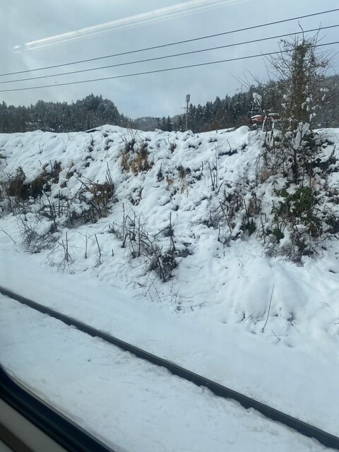 途中、米沢あたりを通過したとき、一瞬すごい雪景色!あぁ、東京を離れて東北に来たんだなぁと、車窓の景色に胸が躍りました。