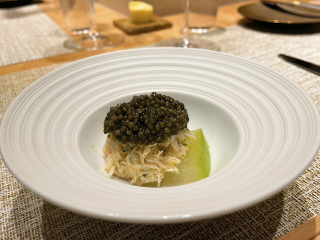 今回はカウンターの端でキッチンを見渡せる位置。ホール中央のキッチンでチームで次々と綺麗に盛り付けられていく様は見ていて惚れ惚れします。