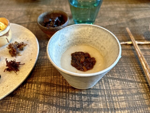 中に鱈の白子ソテー入る菊芋のスープに炒めた菊芋、菊芋チップスも添えて、ロースト胡桃の搾りたて胡桃油を垂らしていただきます、菊芋の香り甘みをしっかり味わえる一皿