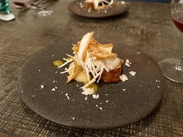 焼きっぱなしで中を甘く仕立てた太いポワロ(リーキ)の上にチーズと牡蠣、コクワと生姜とラッキョのピクルスをあわせています、牡蠣の旨みとピクルスのアクセントとともにネギのネガティブさのない甘みをいただけます