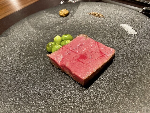 上田畜産さん但馬玄・経産牛のロースです、融点の低い脂と味わいの濃い肉を堪能です、シンプルに塩で