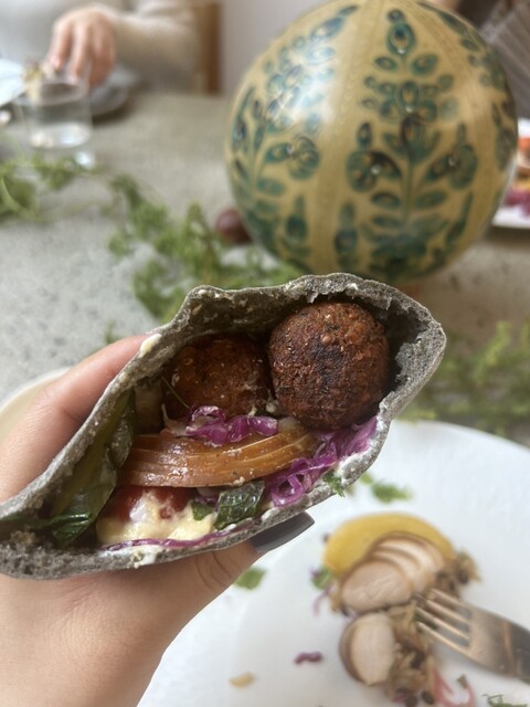 パン?に挟んでいただくのですが、スモークチキンかファラフェルか両方を選ぶことができます。