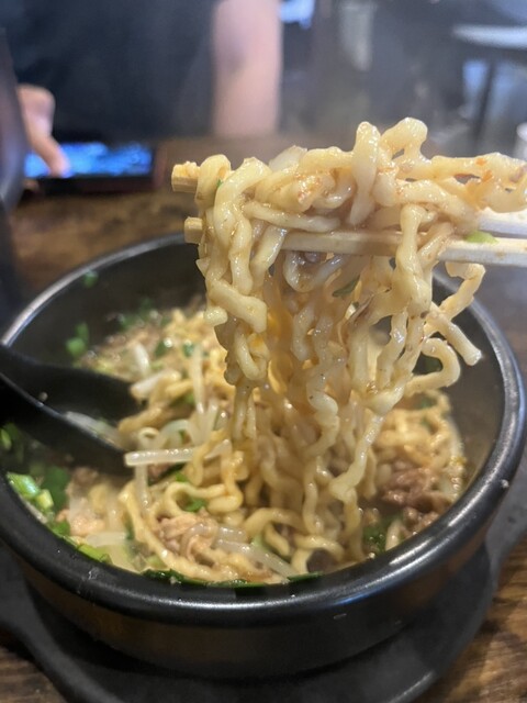 肉ミンチ、小ネギ、もやし、麺、唐辛子が撹拌されたところで熱いので取皿代わりの小丼に移して粗熱とりつつ、啜る!