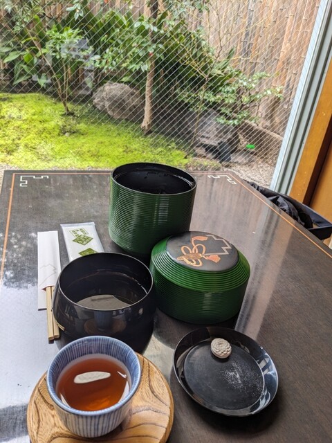 観光で疲れフラフラと歩いていたら素敵な佇まいのお店を発見!ふらりと入ったらお待ちの方がいましたが「相席でも宜しければ直ぐにご案内出来ます」との事で案内して貰いました。メニューを見たら何と鍵善良房でしかも本店ではありませんか!これは食べたいと思っていたくずきりを頂くしかない!とくずきりを迷わず注文。白蜜と黒蜜が選べますがここは迷わず黒蜜を選びました。程なくしてくずきりが到着。入れ物も素敵です。