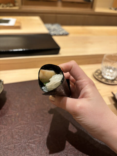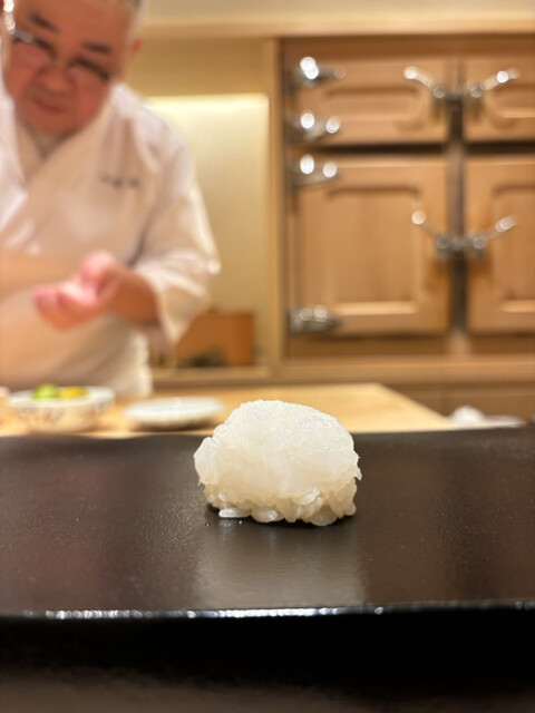 和紙のように薄く切り、大根おろしのようにまとめてシャリの上に。ふわっとほどける新食感、塩とすだちで旨味が際立ちます✨