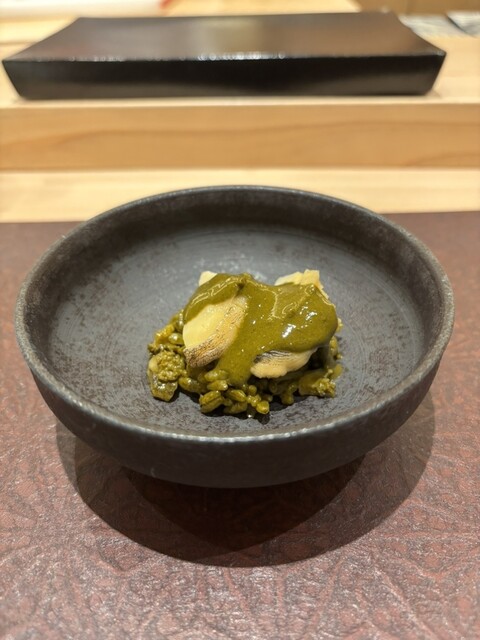 鮑の肝と酢飯を合わせた“鮑リゾット”風。まったりとした食感で甘味のある酢飯と弾力を感じつつ柔らかい鮑が最高のハーモニー♪