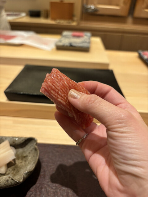 50本の包丁を入れ、更にトロ(スキ味)をネタとシャリの間に挟んでいるので、とろけ具合がすんごいことに❤