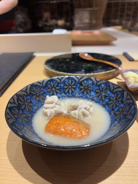真鱈白子の弾力ある甘みと、鮭の香ばしい風味が対照的。酒粕のコクのあるスープに柚子の香りが加わり、後味は意外にも軽やか。身体がホカホカ温まる一皿。