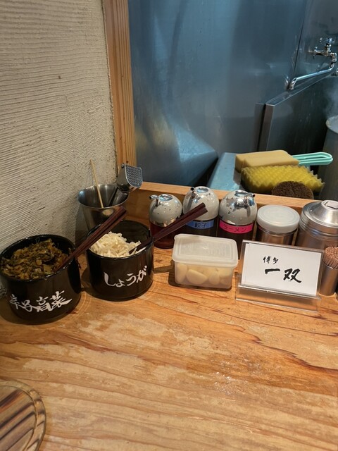 途中味変で辛子高菜としょうが(赤でなく白)を入れて、これまた博多ラーメンの基本トッピングスタイルを交え、大満喫しました