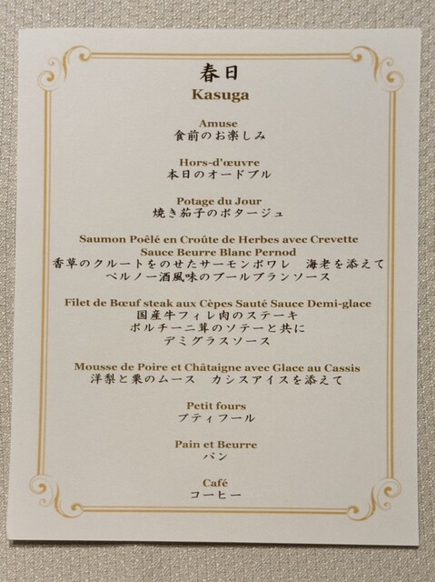 春日コースに、お料理に合いそうな、ロゼシャンパン、白、重めの赤の3種のグラスワインセットをお願いしました。