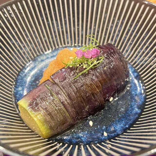 お通し(深雪茄子の揚げ浸しと山科唐辛子 りんごドレッシング添え)