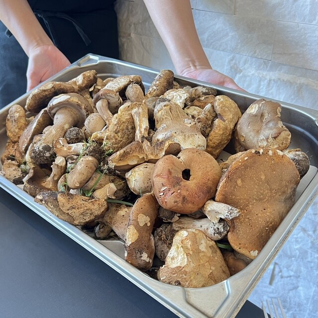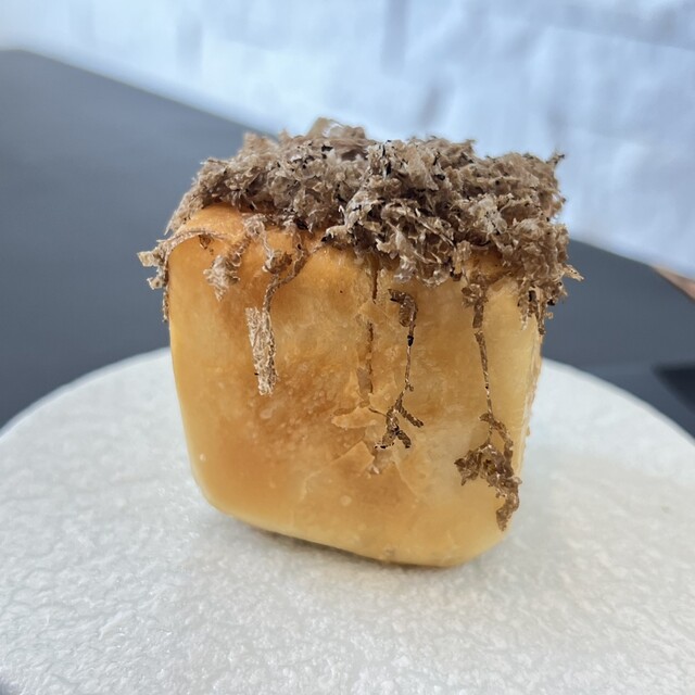 焼き立てのパンで、その上からイタリア産サマートリュフをたっぷりとかけている。