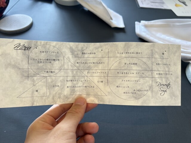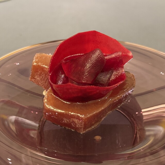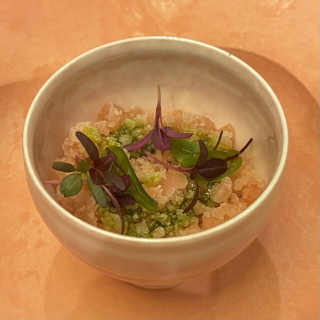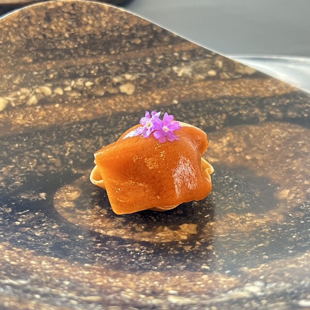 季節が変わっても変わらず定点として提供される最初のアミューズで、甘いミニトマトを飴にし、イタリア産の結晶塩とハーブをあしらった一品で、スギさんに来たことを再確認させてくれる。