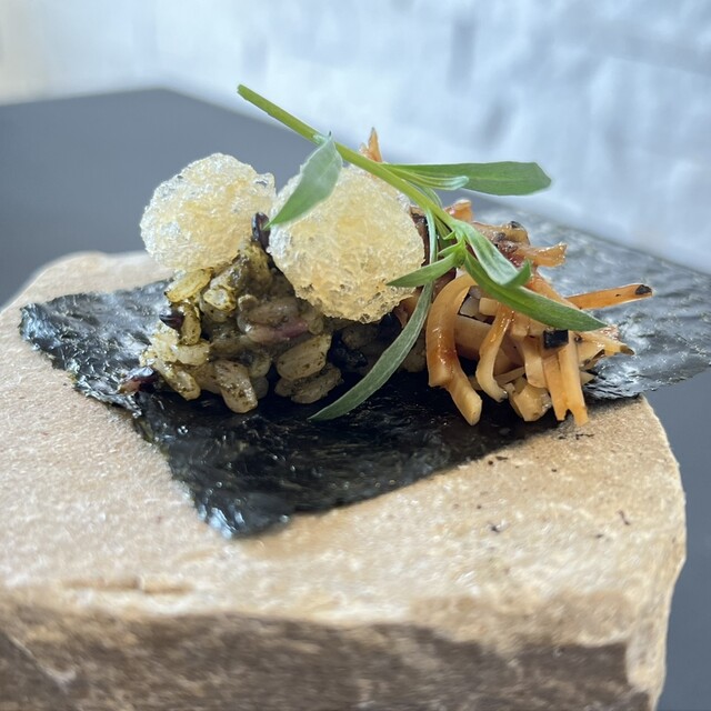 黒鮑のR(リゾット)を海苔巻きにしていただく創作メニュー。