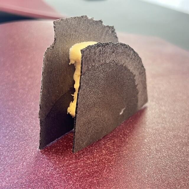 ピーナッツの殻などを使ったサステナブルなお皿で千葉の地層を再現し、その上に一口大のタルトをのせたもの。