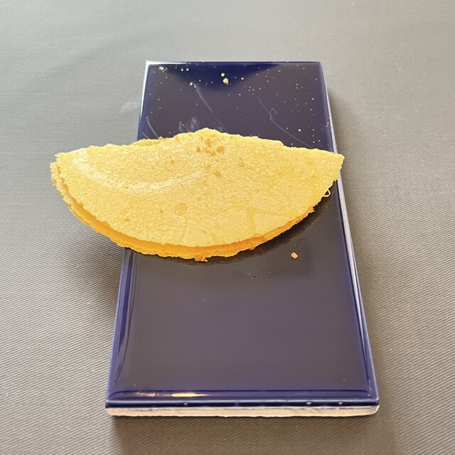 そこに乗っているのは、伊勢海老を塩麹と合わせて2日間寝かせたものと、伊勢海老で作ったと言うホワイトチョコをパイの中に入れ込み、海老味噌をゼラチンで固めて、シート状にしたものを乗せた一品。