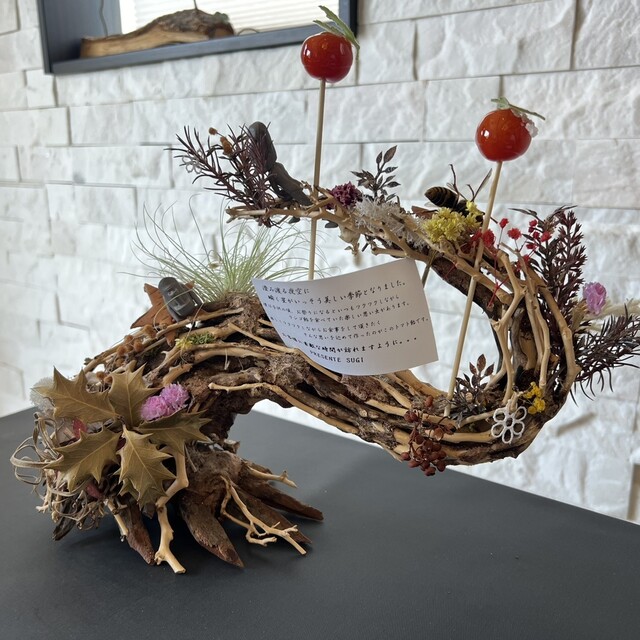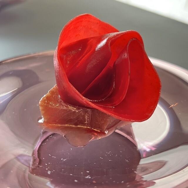 ブーケのような造花に刺さっているのがトマト飴で、そこにイタリア産の岩塩、ローズゼラニウムを乗せたアミューズ。
