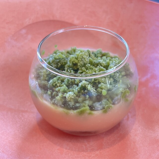 急遽この日仕入れた富里のメロンを使ったアイスで、メロン本来の甘味を活かした、風味豊かなアイスに、マリーゴールドとホワイトチョコレートを合わせた粉末状のチョコレートを添えている。