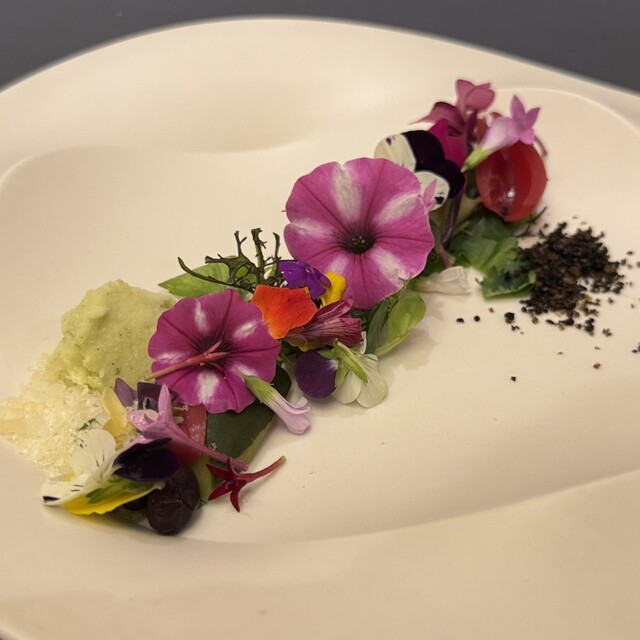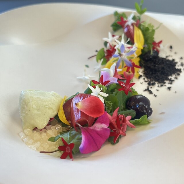 なんとも美しい見た目の一皿で、ドレッシングにはバニラとライムをアイスにしたアイスドレッシングを。