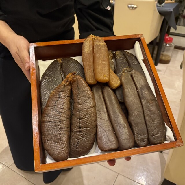 かなりインパクトのあるメニューだが、スズキの塩漬けミイラを食器の一部とし、スズキの生ハム風の塩漬けをいただく。