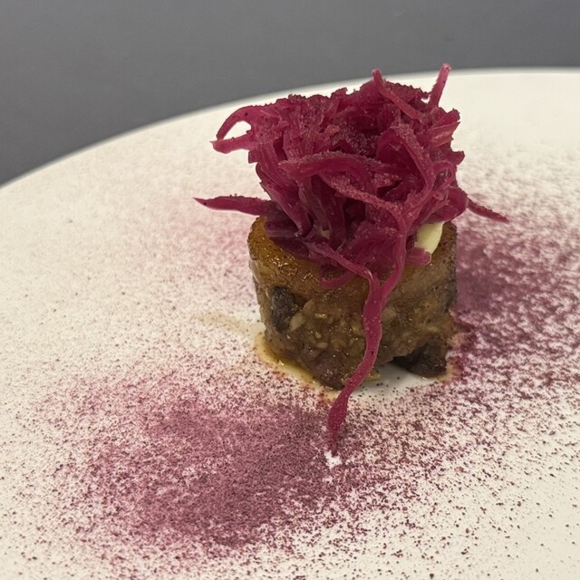 燻製のタルタルにし、すりおろし大根とヒバオイルのマヨネーズ、発酵しょうが刻みと和えて、紫キャベツの発酵キャベツを乗せていただく。
