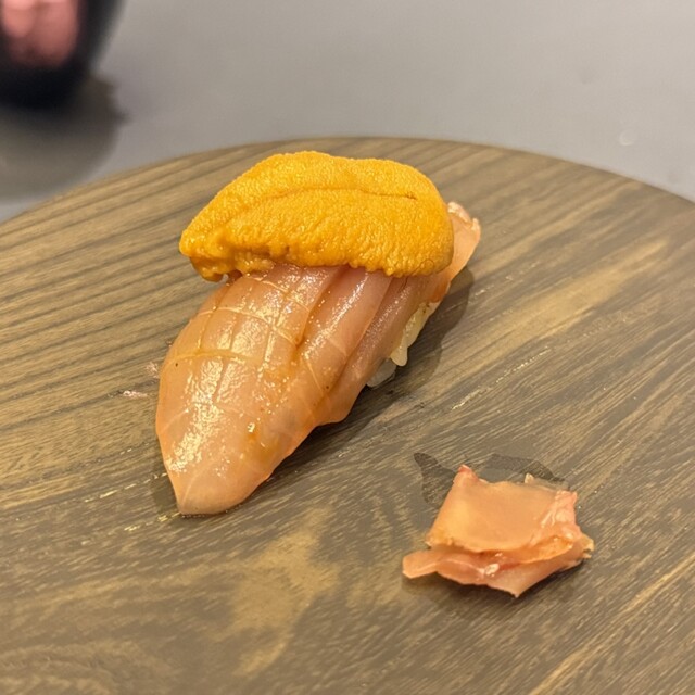 これに雲丹を乗せ、さらにシャリの中にはトリュフ風味の卵黄を忍ばせたもの。