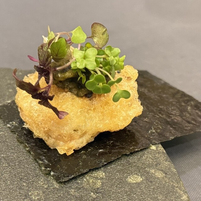 蛤のフリットに、鮑の肝のリゾットを乗せたもので、リゾットにはアールグレイの発酵ビネガーをあしらっており、風味も豊か。