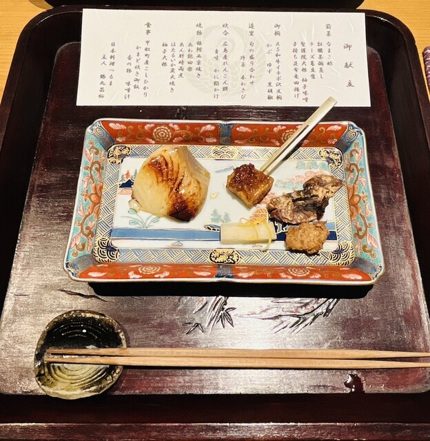前菜→御椀→造里→炊合→焼物→食事→甘味