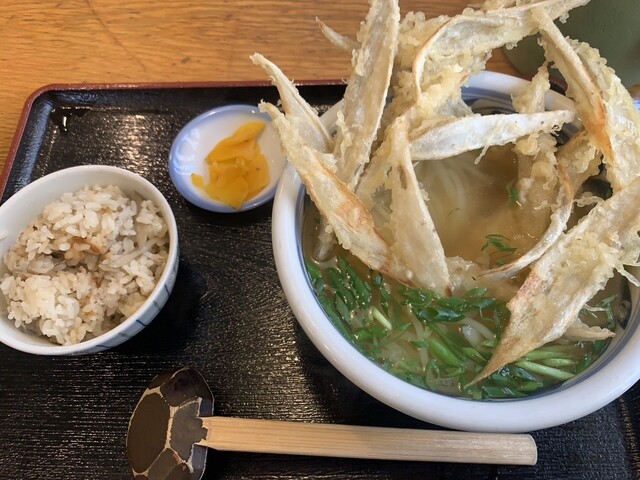 平日、ランチということもあり、並ばずにスムーズに入店。定番のゴボ天うどんとかしわご飯のセットを注文しました。