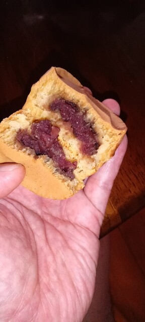 小ぶりな回転焼き、甘さ控えめの餡でとても美味しいです。