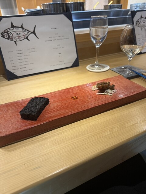 鮪の希少部位、脳天にあるむのみをがんもどきで。ミモレットチーズがトッピングされており、コクがプラスされて美味しい。