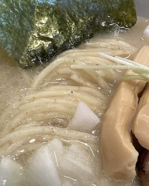 濃厚スープなのでポタージュみたいに濃厚クリーミーなもの。魚介や豚骨、鶏ガラの複雑な味わい。ホタテを探してみたがスープの中からは見つけられず。