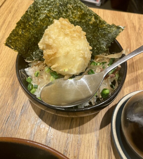 〆には半熟卵の天ぷらご飯までいただき、明日への補給は完了。