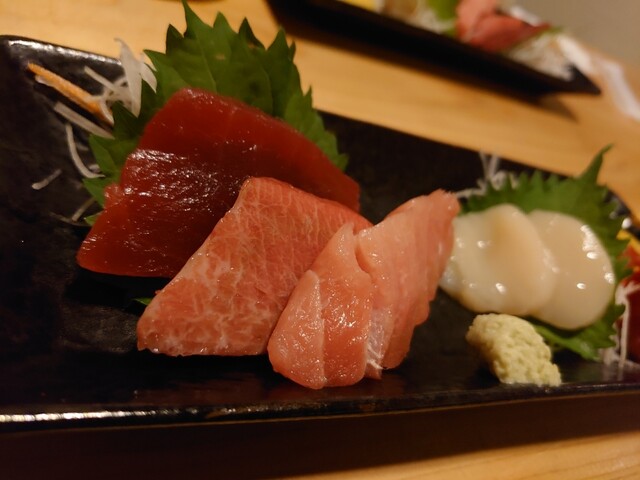 本マグロの赤身、中トロ、大トロ、ホタテ、中落ち、鰹全て厚切りの刺身。