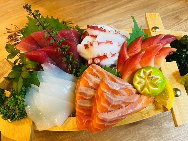 今回はお刺身を中心にいくつかいただきましたが、まず最初に運ばれてきた盛り合わせがとても華やかで、思わず写真を撮りたくなる綺麗さでした。赤身・サーモン・ホタテ・つぶ貝・イカ・タコなど、全体的に新鮮さがしっかり感じられ、特にサーモンは脂がほどよくのっていて甘みが際立っていました。赤身はクセがなくてスッと入ってくる味わいで、タコは食感がプリッとしていて噛むほど旨みが広がります。