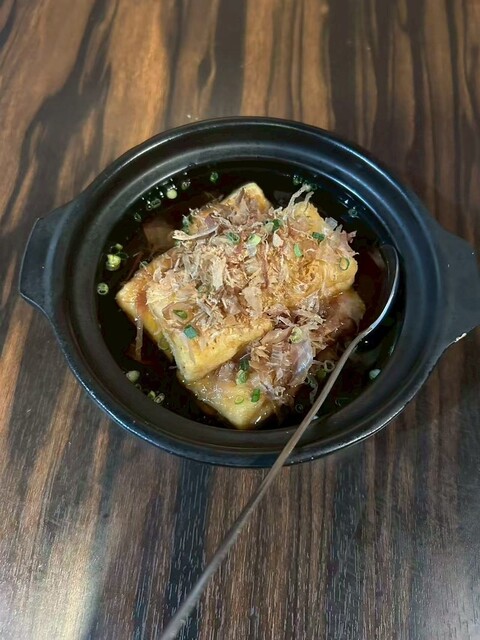 続いて揚げ出汁豆腐。黒い器に盛られ、上にはたっぷりのかつお節。出汁がしっかり効いていて、外は軽く香ばしく、中はなめらかな食感で、箸休めにもぴったりの一品でした。